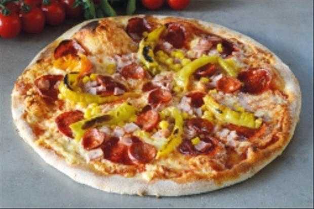 Rajčatová omáčka, sýr, salám, klobása, slanina, beraní rohy, kukuřice